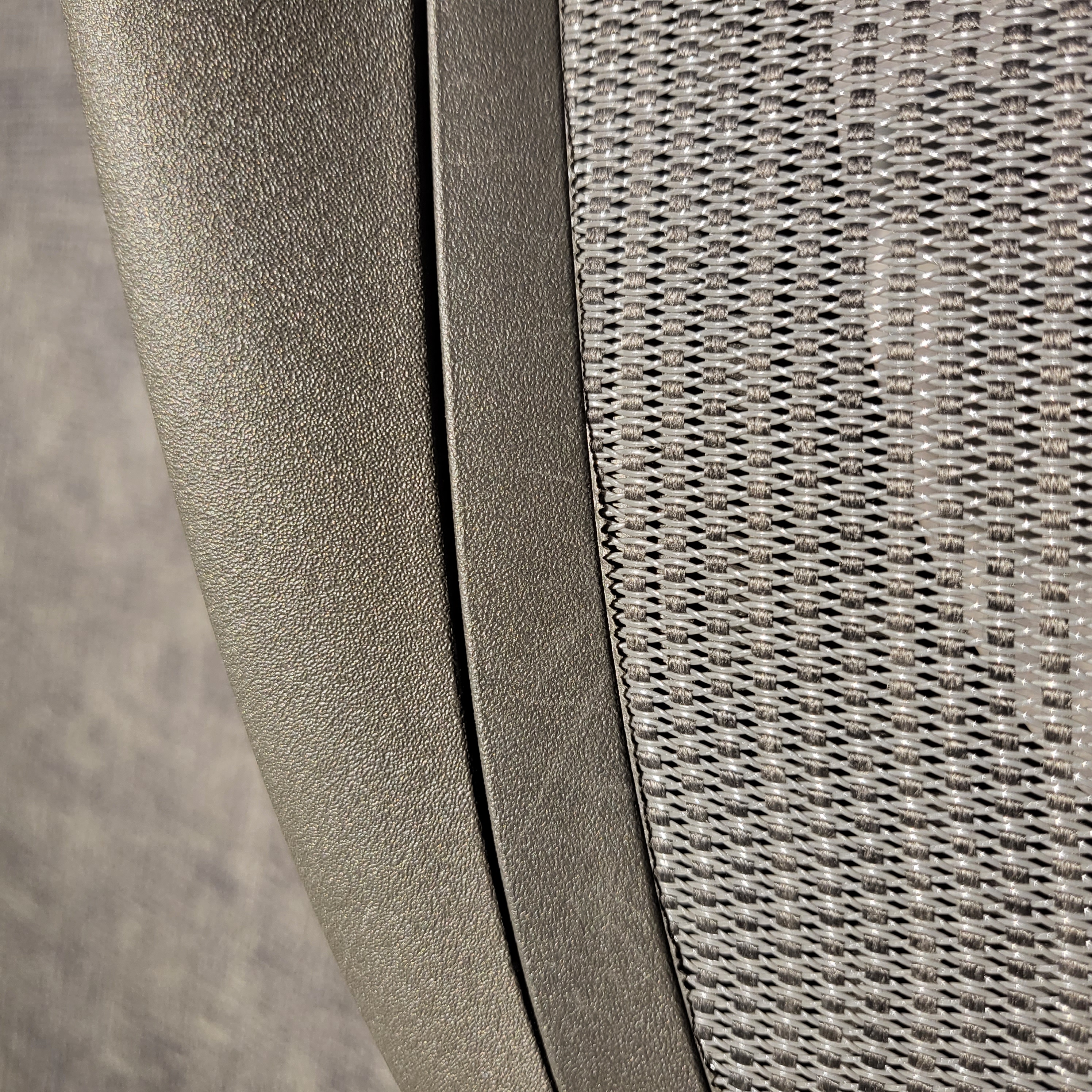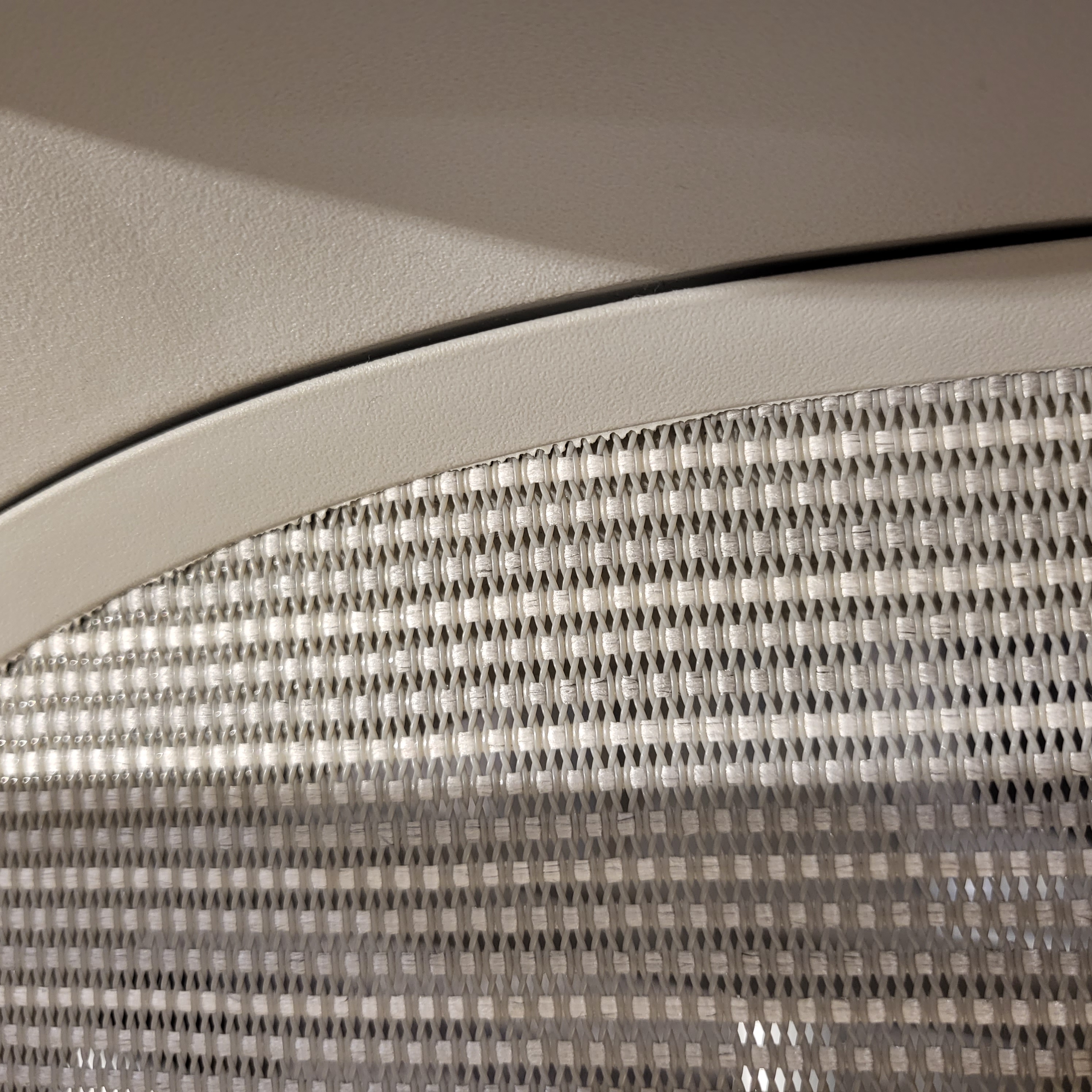 에어론체어의 펠리클(메쉬)부분과 강화플라스틱 프레임의 접합과정에서 탄력성이 뛰어난 펠리클(메쉬)소재의 특성상 접합의 마감이 매끄럽지 않을 수 있습니다.