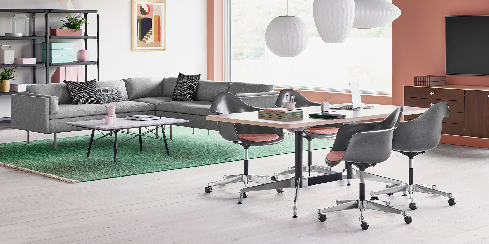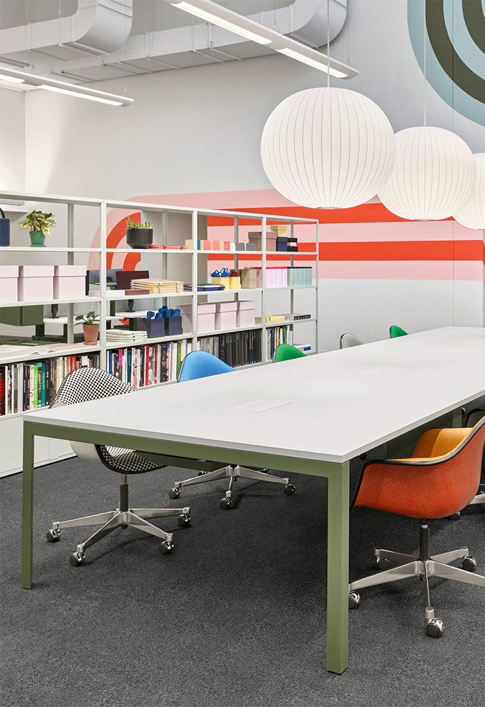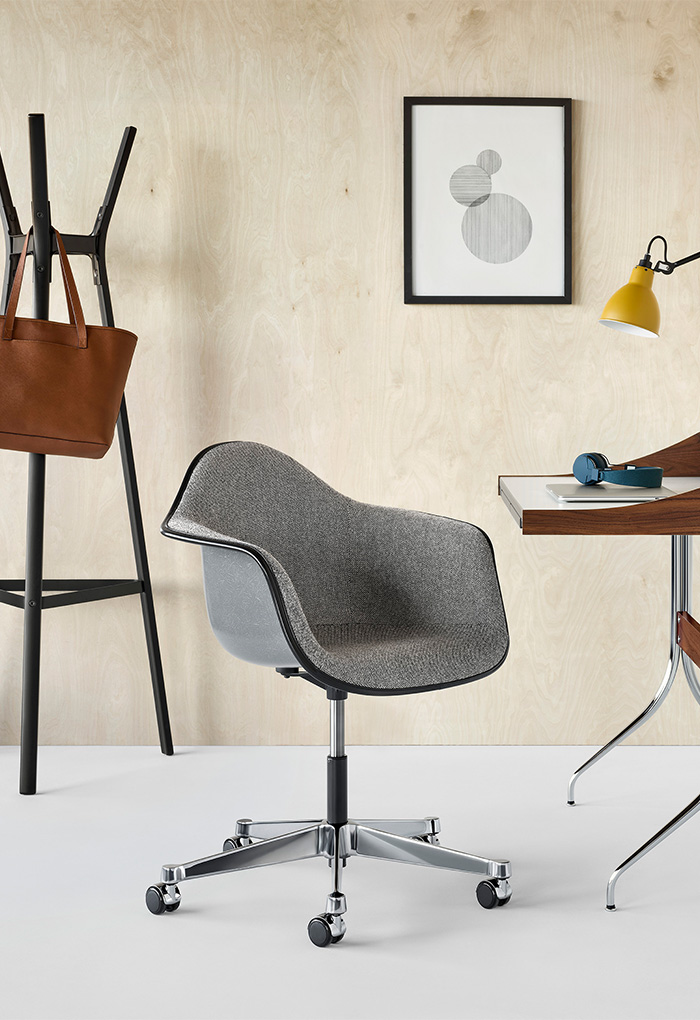 Eames Task Chair의 높이조절이 가능한 암체어 디자인과 안정성을 위해 five-star base와 결합하고 캐스터를 추가해 이동이 편리합니다.