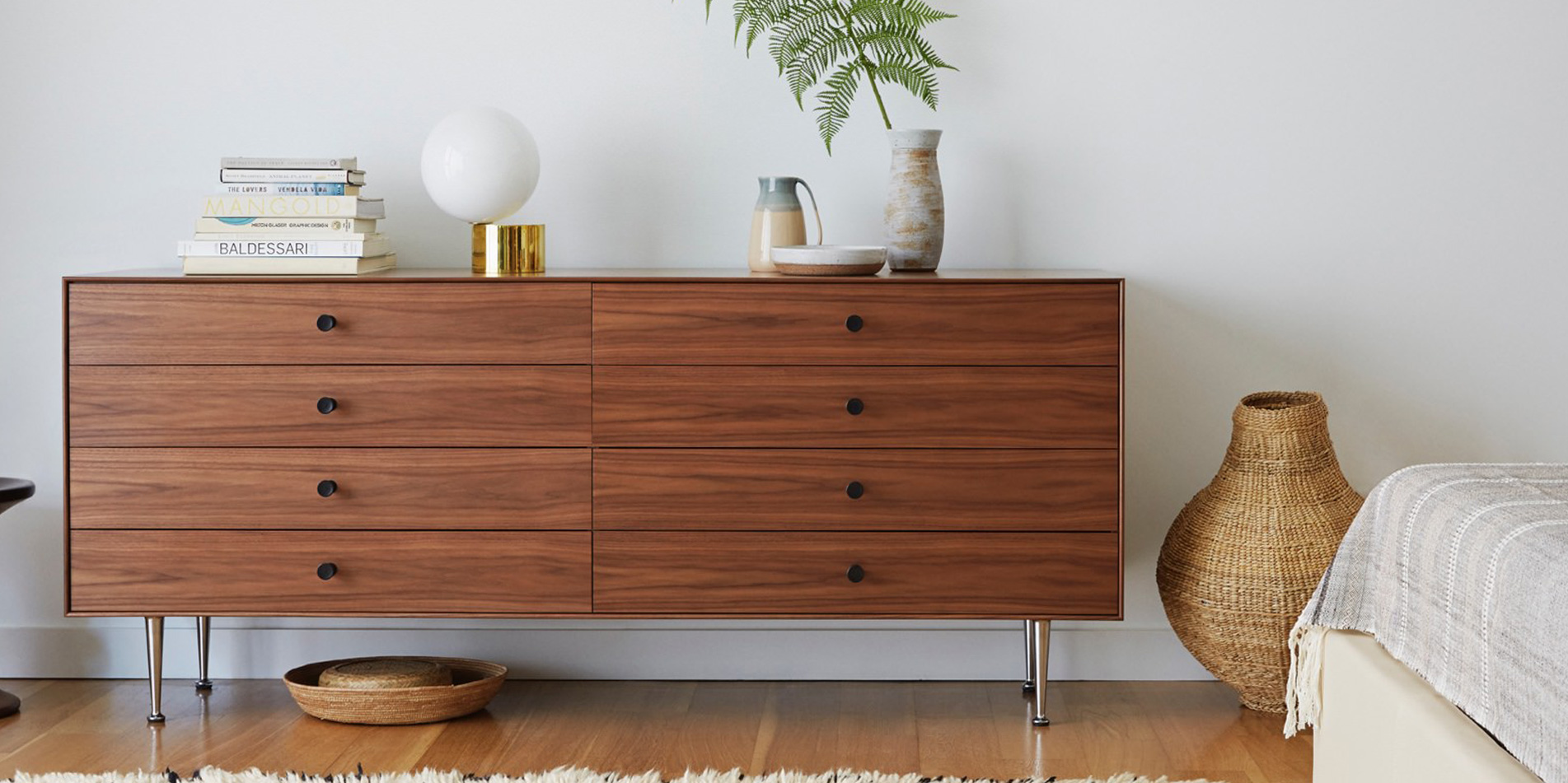 Thin Edge 컬렉션은 더블 드레서, 침대 사이드테이블 및 서랍과 캐비닛의 조합으로 구성되며 최소한의 실용적인 방법으로 우아한 수납옵션을 제공합니다