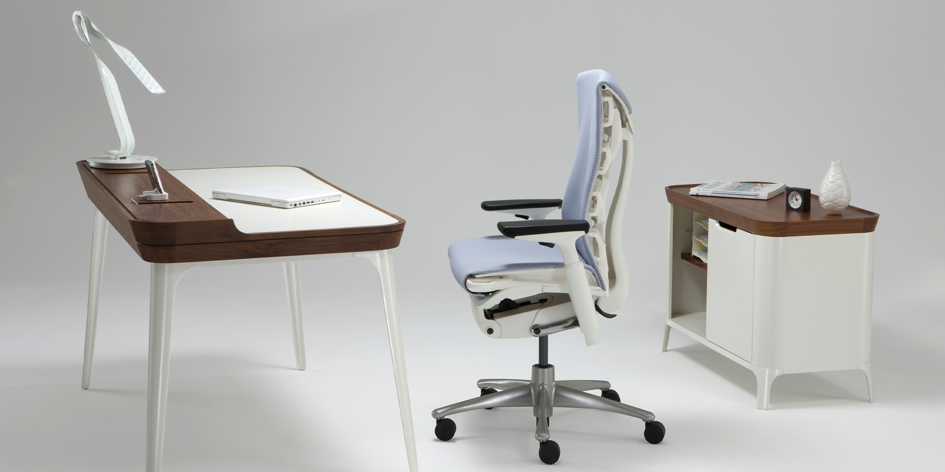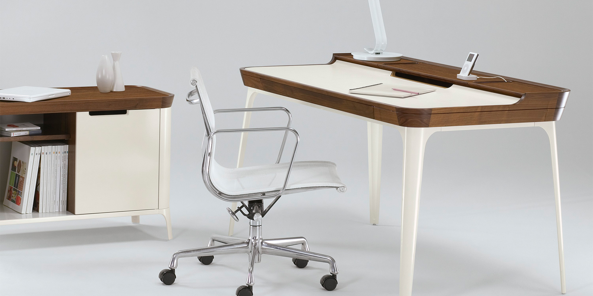 Airia 시리즈를 디자인했습니다. Airia 시리즈는 월넛과 도색된 알루미늄의 대비되는 조합으로 고전적이면서도 우아한 분위기를 자아내고,